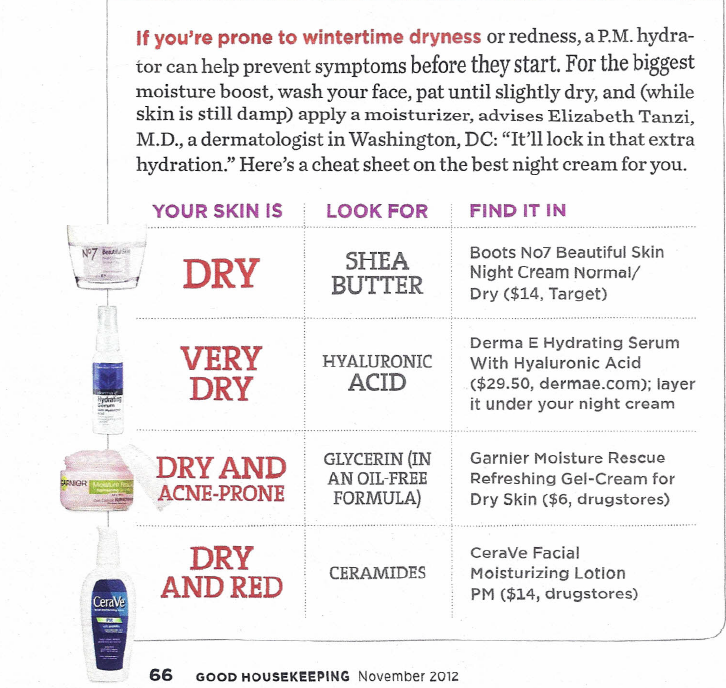 And finally a little cheat sheet from the article in Good Housekeeping to help you find the right moisturizer for your dry skin concerns since all dry skins are NOT the same!:
